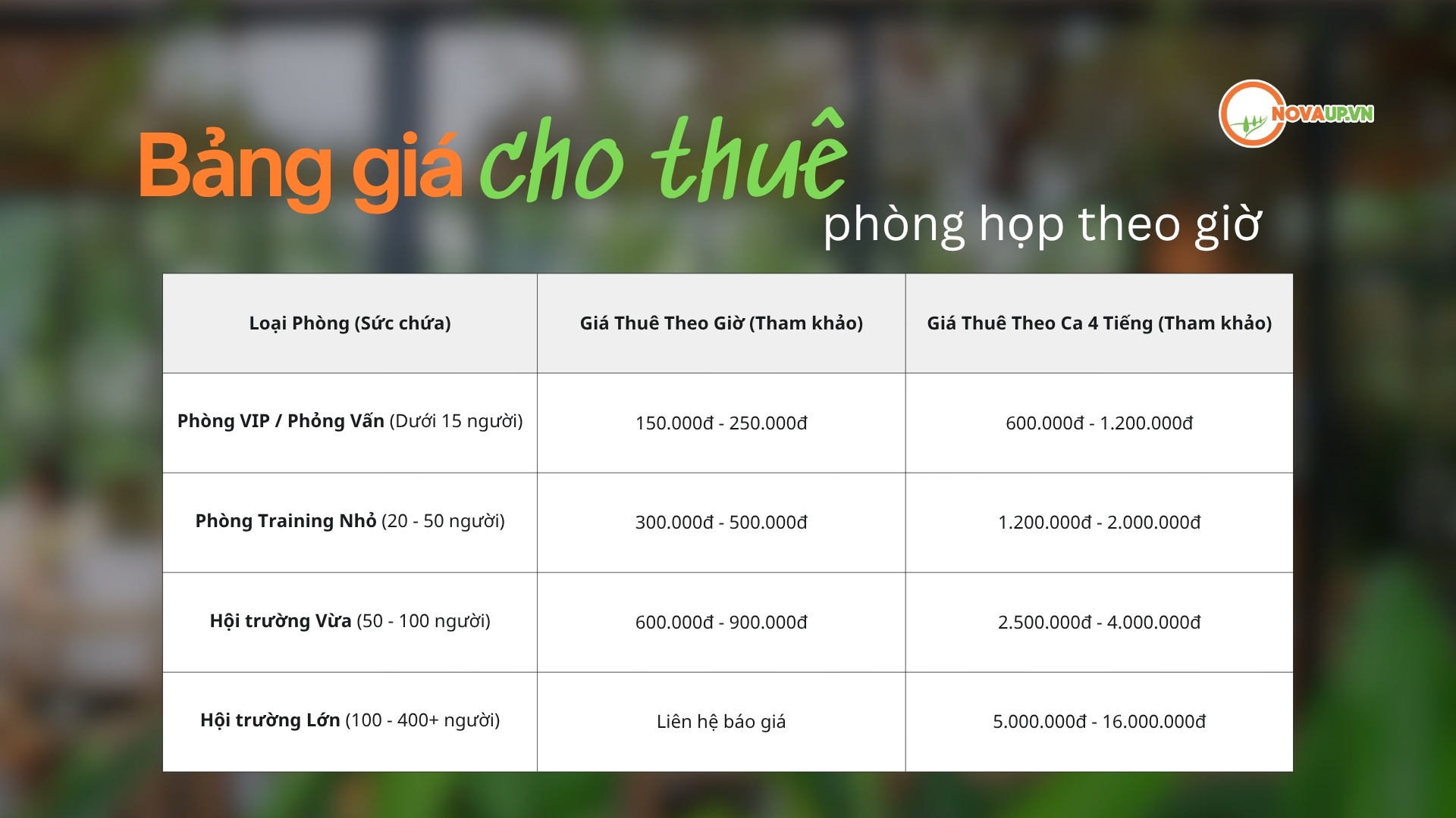 Cập nhật bảng giá thuê phòng họp theo giờ tại Hà Nội mới nhất của Novaup. Chi phí linh hoạt theo giờ, theo buổi (ca 4 tiếng) chỉ từ 150K/giờ. Đầy đủ tiện ích, cam kết không phát sinh chi phí ẩn.