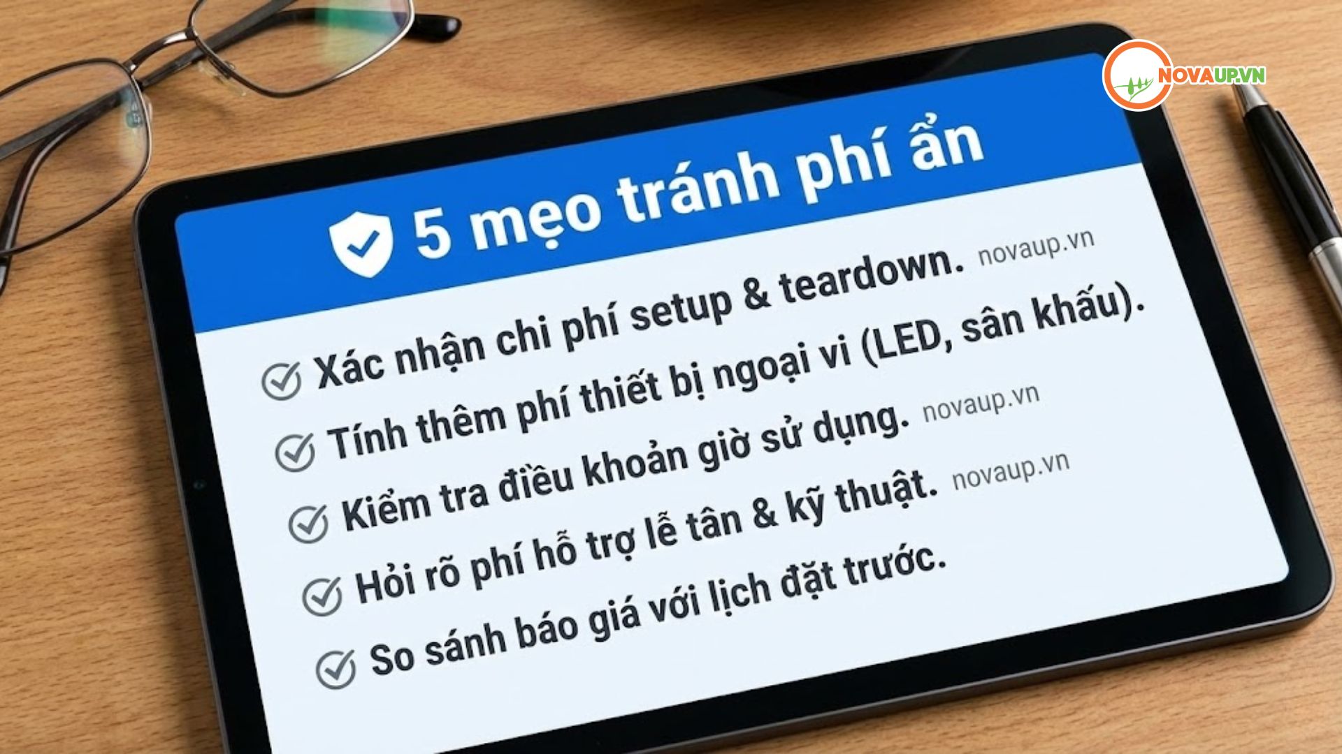 Một trong những nỗi lo lớn nhất khi thuê phòng sự kiện tại Hà Nội là phí phát sinh và chi phí ẩn. Novaup chia sẻ bảng giá tham khảo và mẹo để bạn tối ưu ngân sách cho tiệc cuối năm